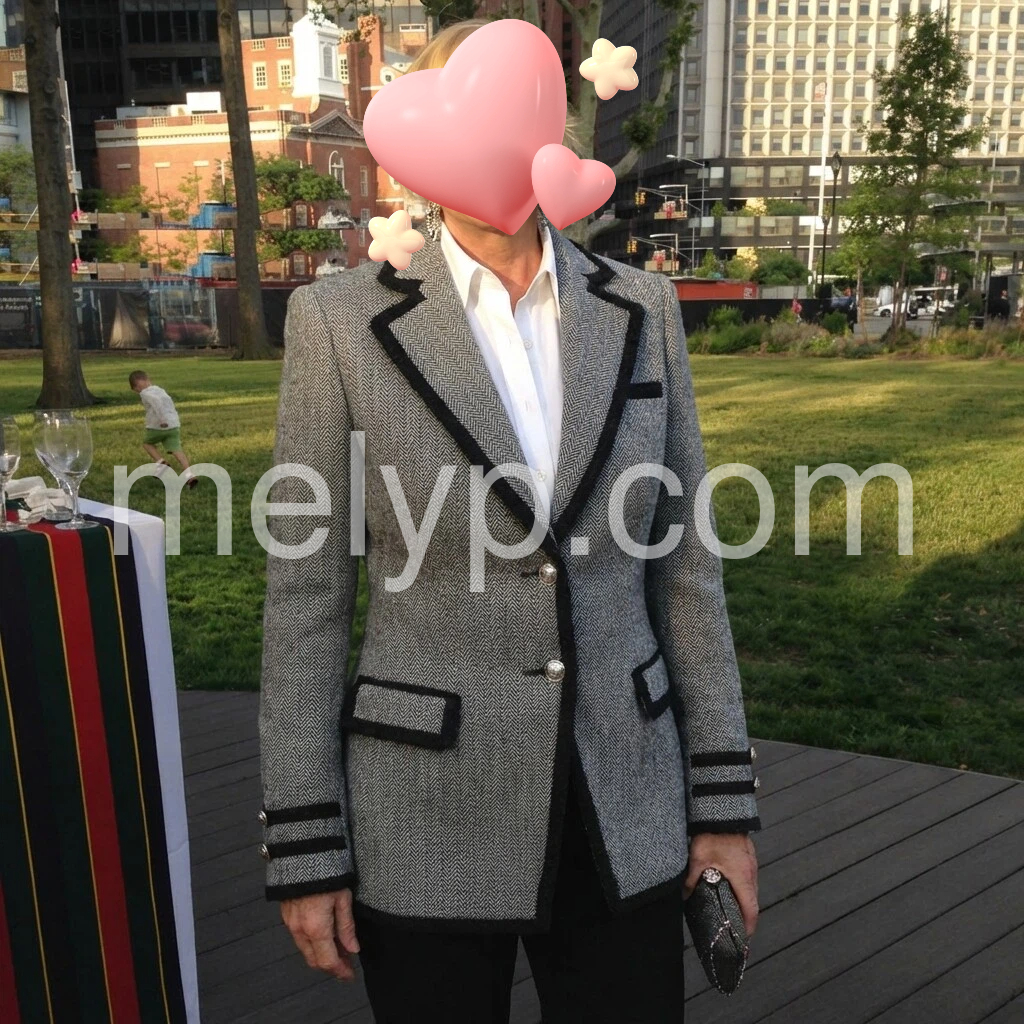 Chic Herringbone Blazer with Black Trim and Classic Double Breasted Design