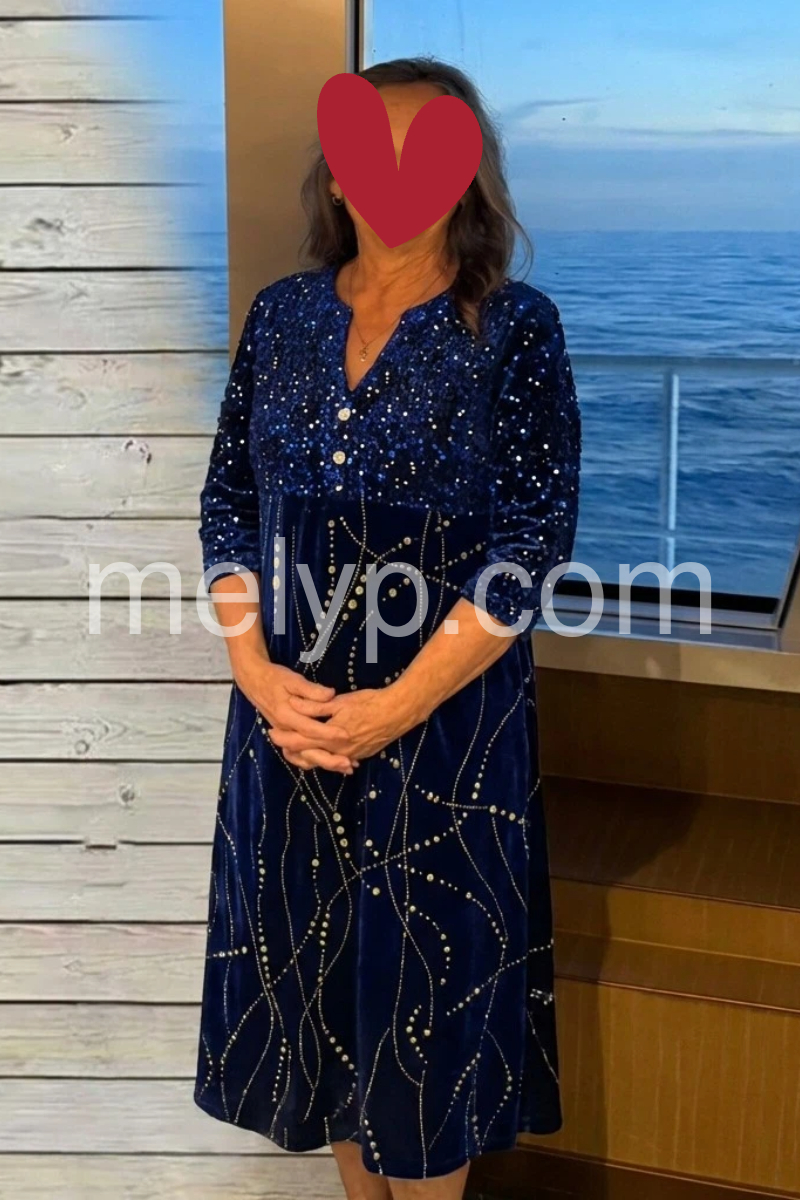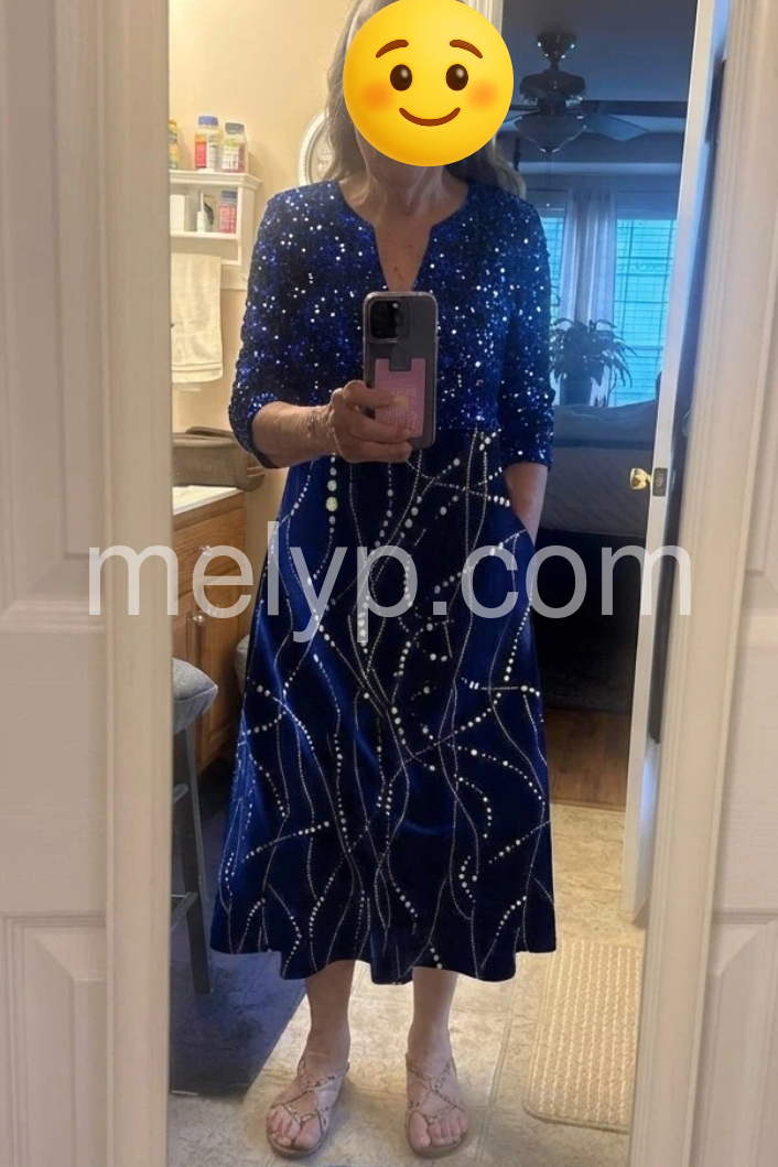 A royal blue and cobalt shade intermingle on this long summer dress covered in white line streaks and dots reminiscent of constellations.ย A button-frontย round collar v-neckline, three-quarter length sleeves, and flared midi dress silhouette keep it versatile, finished with side pockets. Pair it with flats, heels, a black or brown leather jacket, and hoops. Machine wash cold tumble dry low to medium heat. Iron if needed or lay flat to dry.