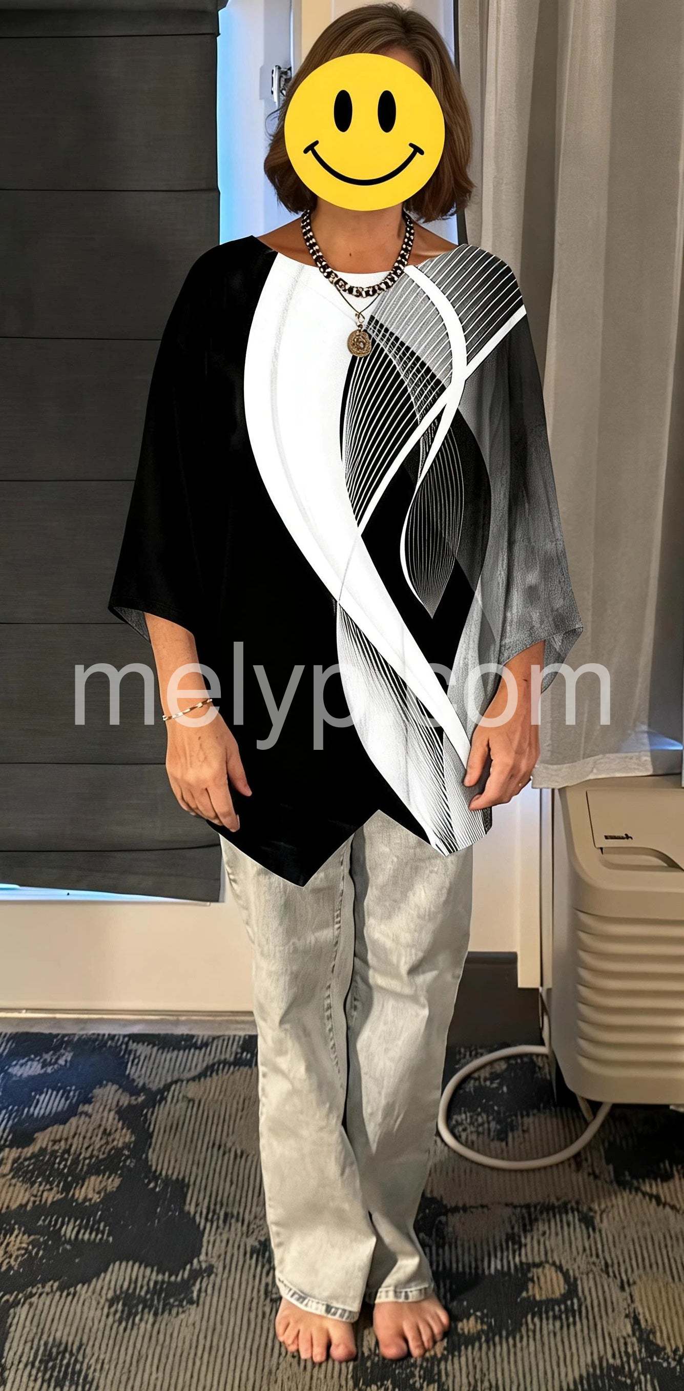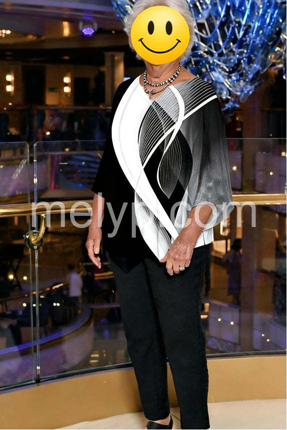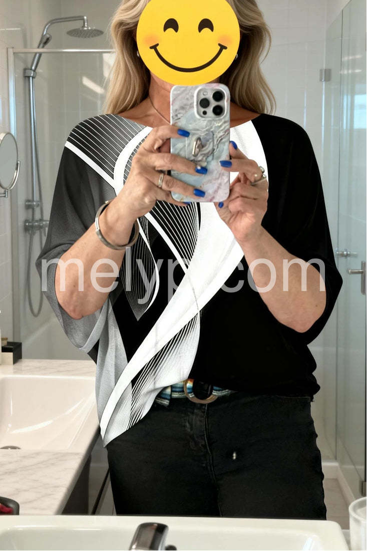 I really like this top. The black and white pattern is very stylish, and it fits well. It's perfect for both casual days and more formal occasions.