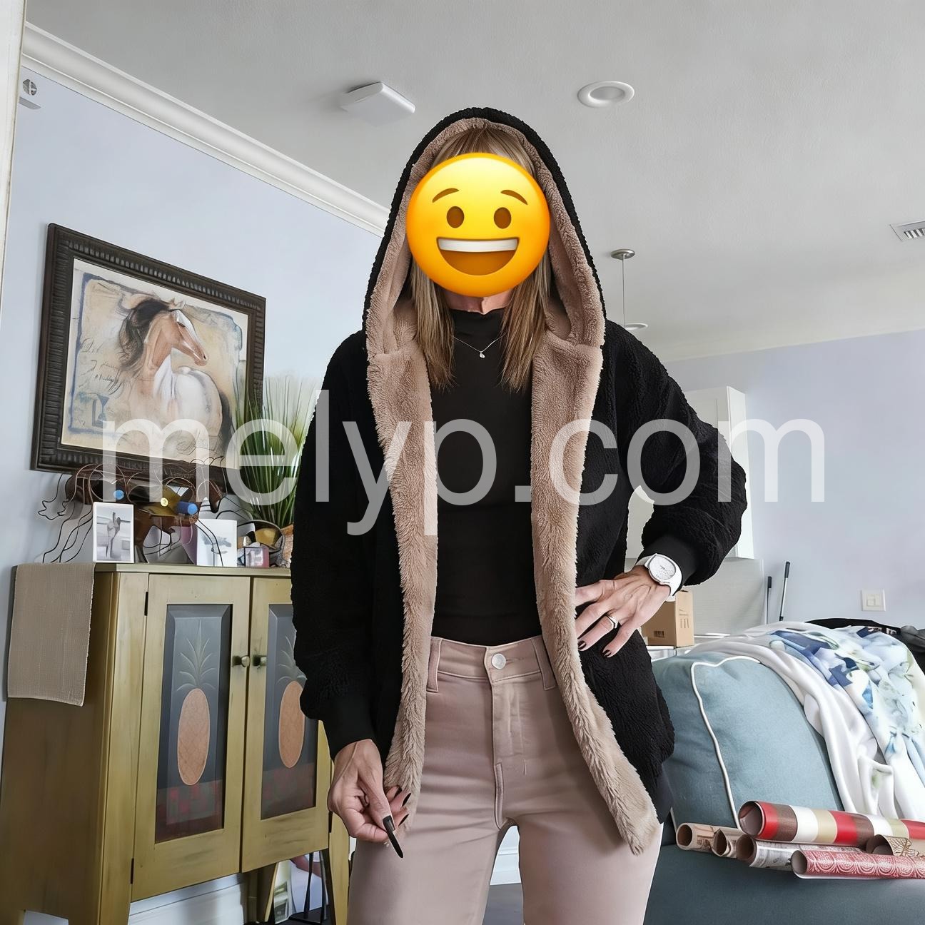 This baggy open-front cardigan features a plush faux fur lining and a cozy hood, blending comfort with style. Its relaxed fit provides ease of movement and a modern silhouette, while the soft lining ensures warmth during cooler days. Ideal for layering, this cardigan offers a versatile addition to your wardrobe that combines casual appeal with luxurious texture.