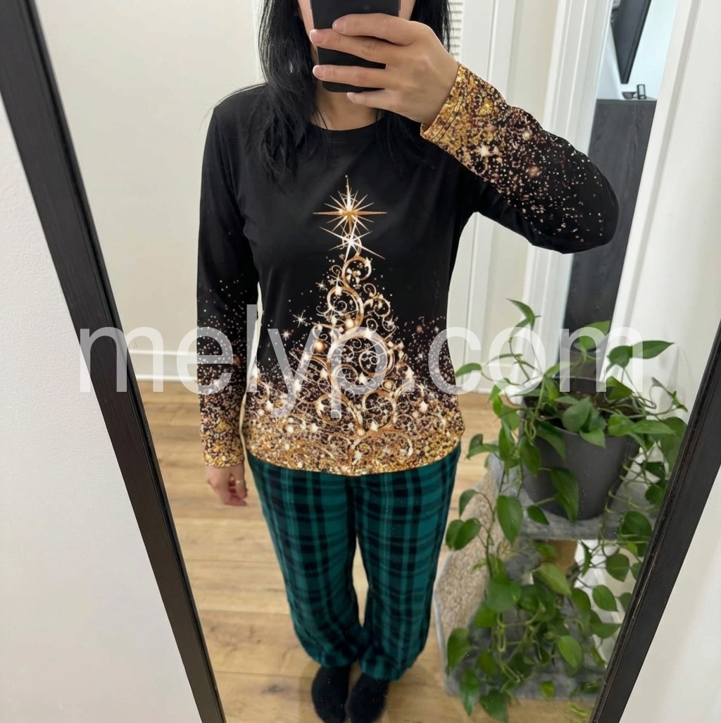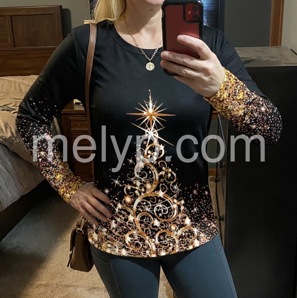 I adore this long-sleeve top! The black base with the golden holiday graphic is such a classic combination. The sleeves are cozy, and the print has that magical sparkly effect that looks even better under daylight and at night. It’s perfect for holiday photos, casual outings, or even just lounging. I’m definitely buying another one in a different design.